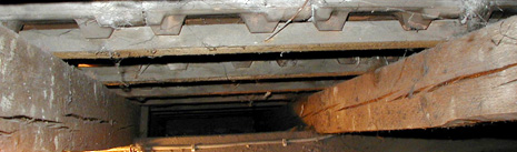 Man kann vom Spitzboden in die leeren Gefache zwischen die Sparren
